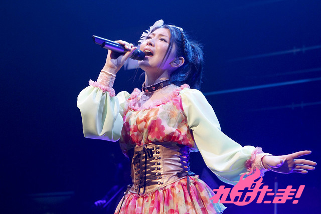 ライブが始まると、みのりんの今年一年の活躍を振り返る映像が流れ、懐かしみつつ本編への期待が高まっていく。そして「Tomorrow’s chance」のイントロが流れ始めると会場にウルトラオレンジと青色のサイリウムのコントラストが広がり、エメラルドの袖に花柄の鮮やかなドレスに身を包んだみのりんが登場。「詩人の旅」、「君がくれたあの日」と序盤から飛ばしていき、「優しい忘却」では一転、静寂なムードの中で優しい声が場内を包み込んだ。