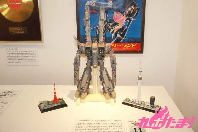 そして立体物も展示され、YAMATO製「1/2000スケール 完全変形SDF-1マクロス プロトタイプレプリカキット」試作完成品もまたスゴイ!河森正治氏が所属するサテライトに飾られていたもので、製品化前の試作版だ。横に、同スケールの東京タワー、スカイツリーが飾られているので、マクロスの巨大さが分かりやすい。