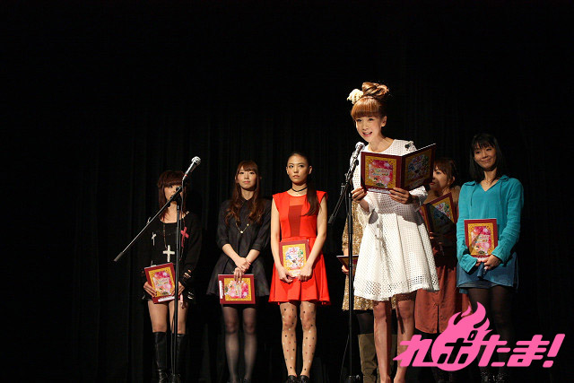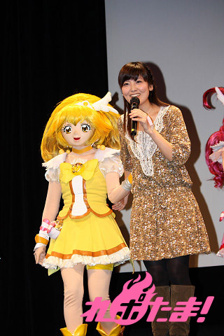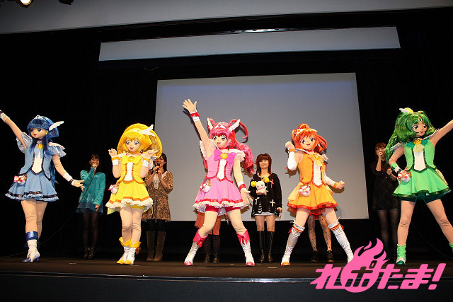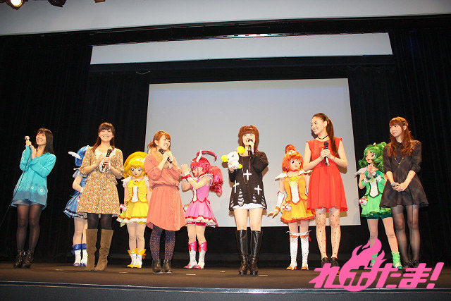 試写の前には舞台挨拶もおこなわれ、キュアハッピー役の福圓美里さん、キュアサニー役の田野アサミさん、キュアピース役の金元寿子さん、キュアマーチ役の井上麻里奈さん、キュアビューティ役の西村ちなみさん、キャンディ役の大谷育江さんの6人がゲストとして登場。