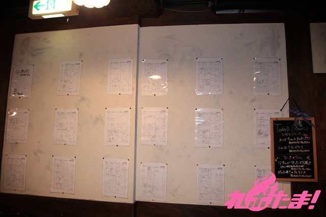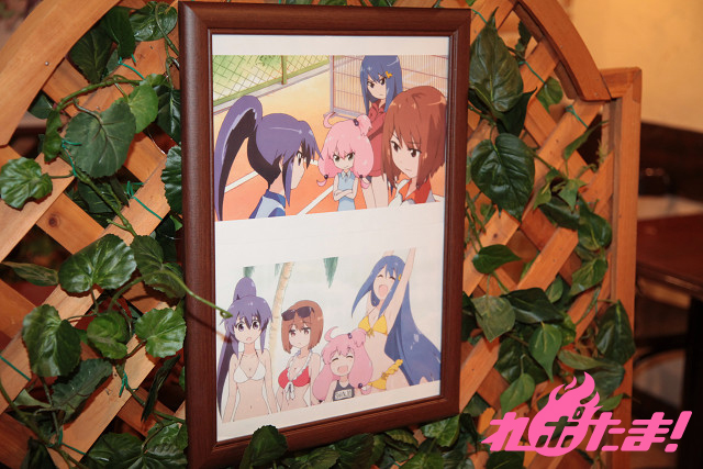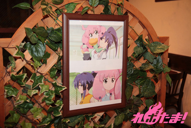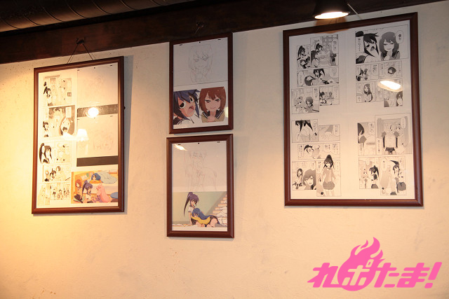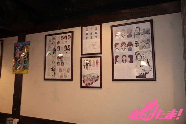 ▲アニメの設定画や色つきのアニメ場面写などを展示。作品の雰囲気が店内に広がっている。