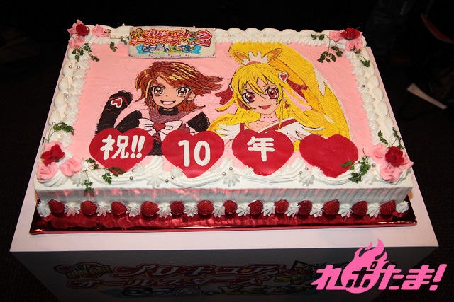 ここで、『プリキュア』作品10年目突入記念、そして映画のヒット祈願を兼ねたケーキが舞台下に登場。