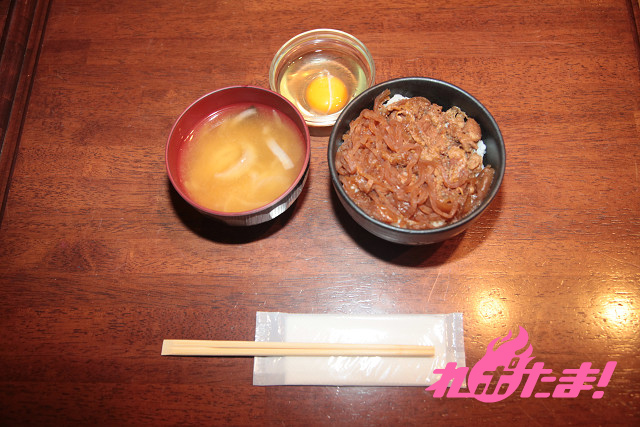 糸こんにゃくが入り、牛すき焼き風の味付けがたまらない。味噌汁にはたまねぎがたっぷり!