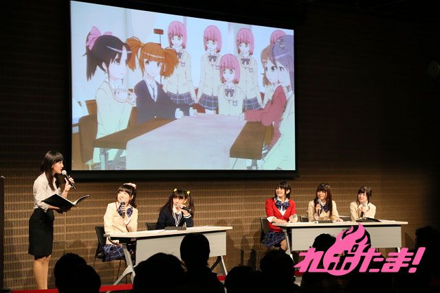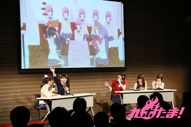 登壇者は西明日香(鈴木結愛役)、明坂聡美(佐藤陽菜役)、荻野可鈴(高橋 葵役)、大橋彩香(田中心春役)、上田麗奈(園田萌舞子他19役)、松澤千晶(司会)。