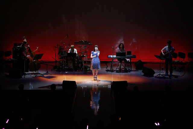 ソロライブツアーでのホールとは違い、ステージと客席の距離感が近い会場に、プレミアムチケットを手に入れたファンたちの期待は開演前よりいやがおうにも高まる。客席の照明とBGMが消え、生演奏のピアノの音が優しく奏でられると緞帳がゆっくりとオープン。姿を現したのは、ライブツアーでもおなじみの北川勝利(G / ROUND TABLE)と末永華子(Key)、高井亮士(Wood Bass)、そして今回新たに参加の若森さちこ(Per)のバンドメンバー達。この種のイベントとしては異例の豪華フルアコースティック編成で、花澤香菜の音楽活動の本気度が感じられる印象的な幕開けだ。