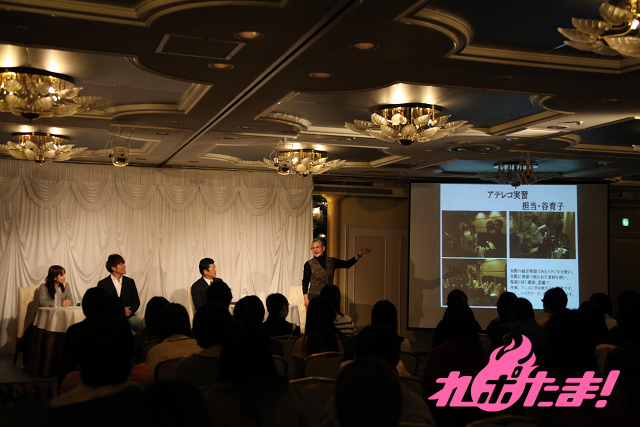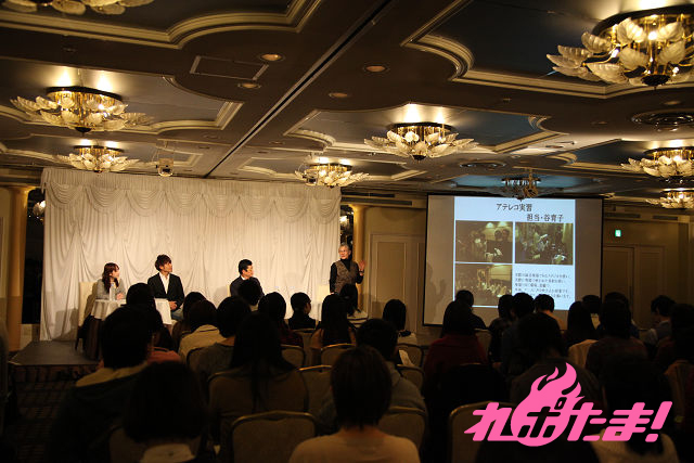 当日は多くの声優志望の若者の前で、マウスプロモーション代表取締役社長の納谷僚介氏が司会のもと、講師の谷育子さん、森田順平さん、卒業生の五十嵐裕美さん、高橋英則さんをゲストに迎え、レッスン内容の紹介や、在籍当時のエピソードなどを語った。