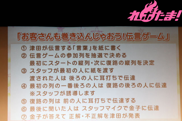 「伝言ゲーム」コーナーでは、津田さんが書いた言葉を、抽せんで選ばれたファン十数名に伝言してもらい、最後に金子さんが答える、というもの。