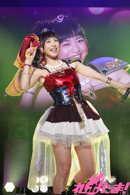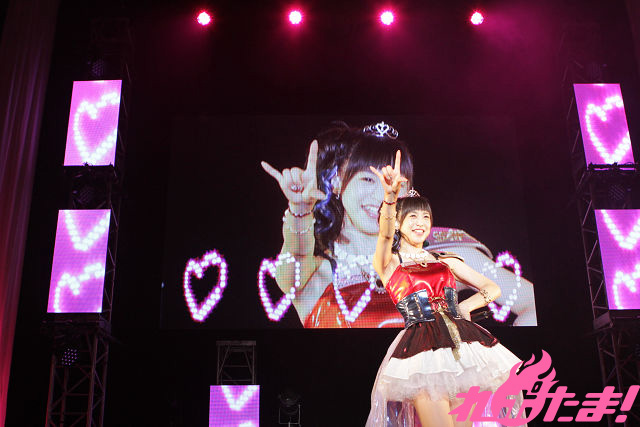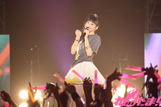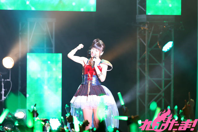 そこからはMCを挟みつつ、ほぼノンストップで徳井さんが今まで歌ってきたキャラソンたちを繰り出していく。今回がステージ初披露となる楽曲も含めフル尺で聴けたのは今回のイベントならでは。セリフが楽しい「サバやだ!チョコプリーズっ! 」やしっとりバラード「やさしい祈り~Guarendo della Luna」から、「セイ・ハ!セイセイ・ハ!」の掛け声も楽しい「heart of blade」まで幅広い楽曲を披露していくと、ファンもペンライトの振りや色で応えていく。
