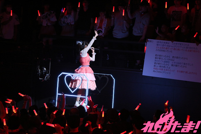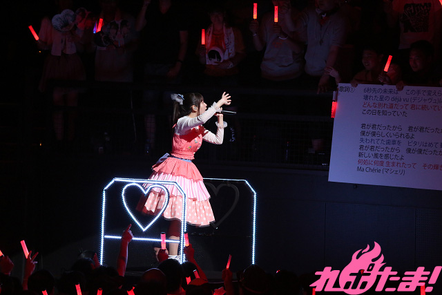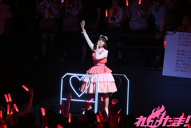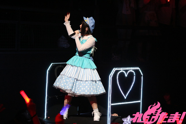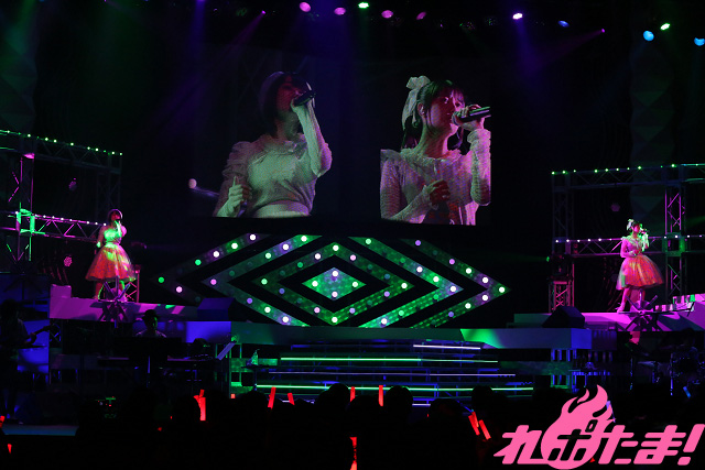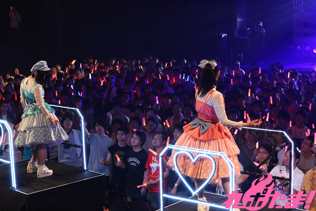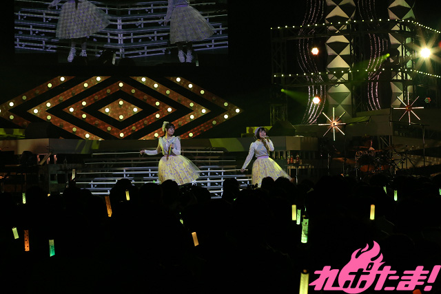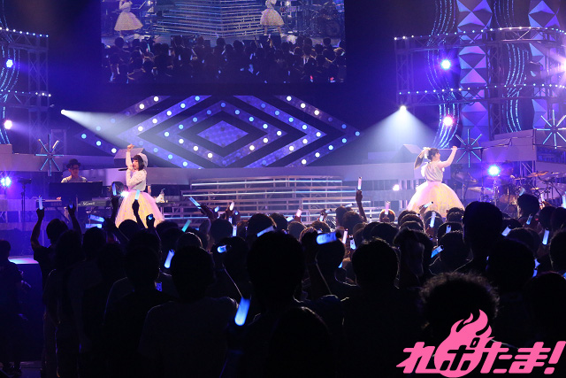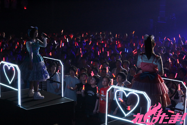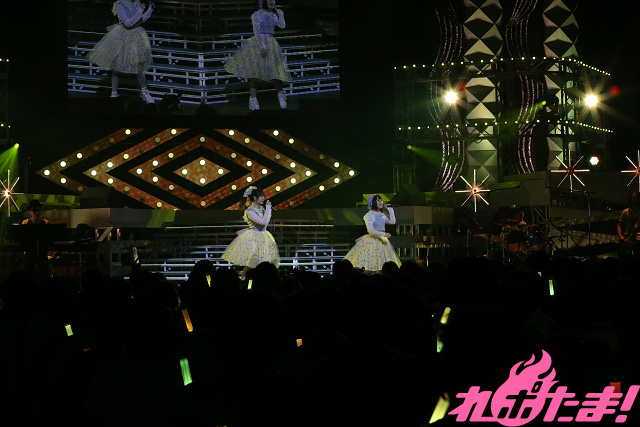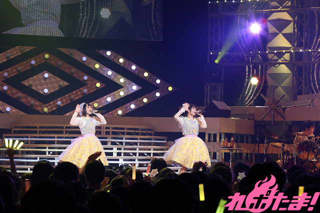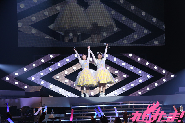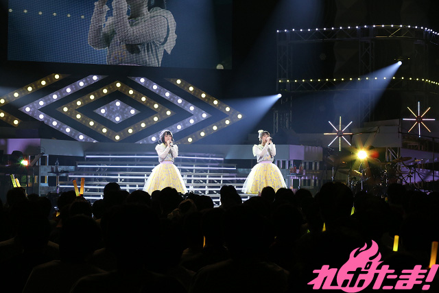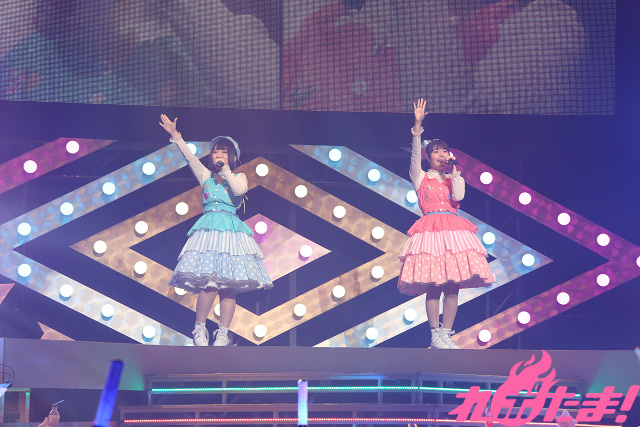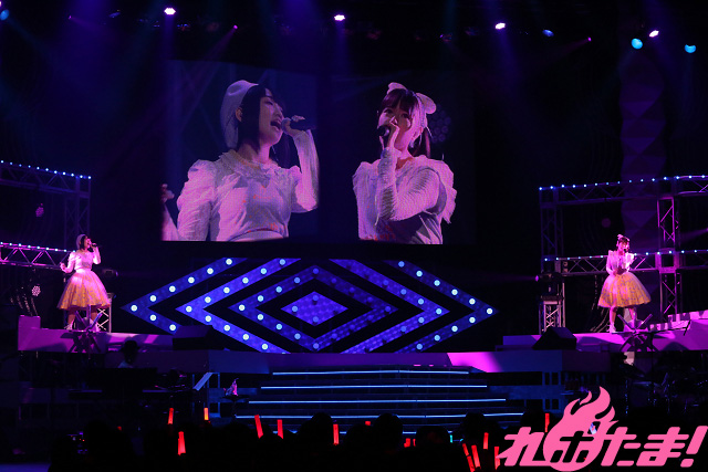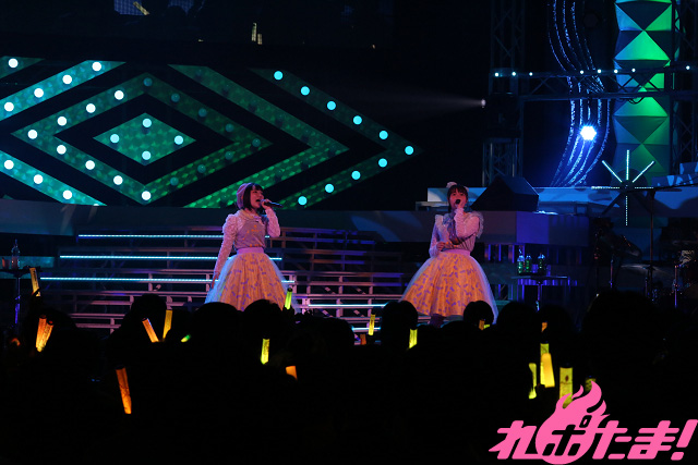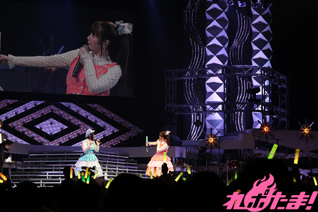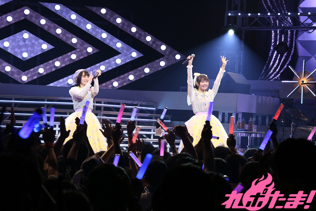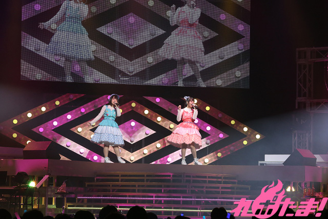 後半はライブパート。リアジュボーンの演奏に乗せて「鏡のデュアル・イズム」、ふたりの掛け合いが楽しい「スキ キライ キライ 大スキ♡」、そして新曲のTVアニメタイアップ曲、アニメ『百錬の覇王と聖約の戦乙女』エンディングテーマ「世界中が恋をする夜」、『七星のスバル』オープニングテーマ「360°星のオーケストラ」を連続で投下。ふたりいわく「デスゾーン」を突破し、ここからは「無法地帯ゾーン」。タオル曲の「#彼氏いません」、キュートな振り付けにも注目の「Eat or Love??」、そして1時間近く前に振り付け講座が行なわれた「キラリキラリ」と続いていった。
