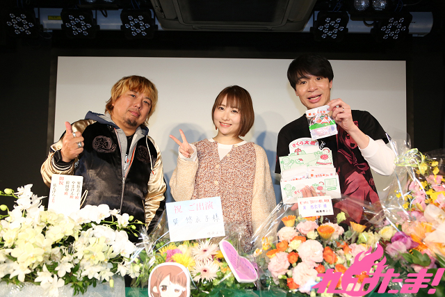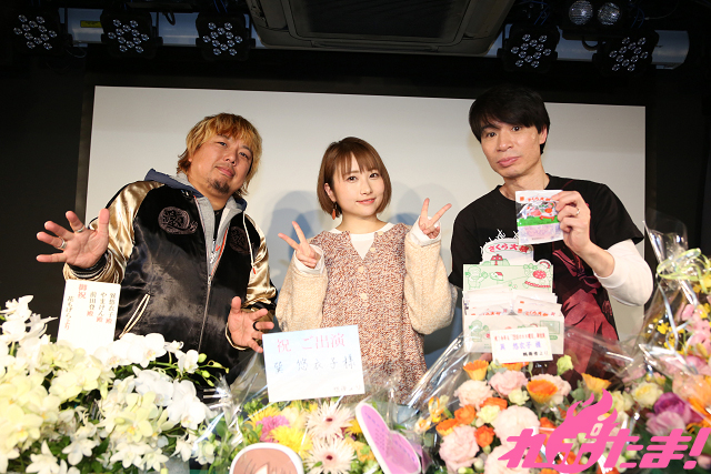 ステージに登場した巽さんは、ファンから届いたたくさんの祝い花にビックリ! 趣向を凝らしたアレンジ花をひとつひとつ確認しながら感謝の気持ちを伝えていた。そしてすっかり慣れた様子で、3人でとりとめもないトークが続いていく。