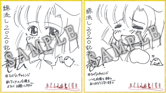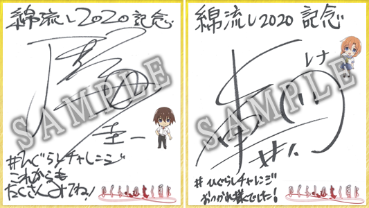 綿流し2020ひぐらしチャレンジを記念して竜騎士07先生、川口敬 一郎監督、保志総一朗さん(前原圭一 役)、中原麻衣さん(竜宮 レナ 役)の色紙プレゼントキャンペーン開催いたします! 各アカウントのフォロー&対象キャンペーンツイートをRTしていた だいた方の中から、抽選でサイン色紙をプレゼントいたします。
