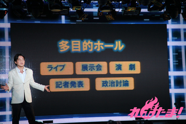 発表会に先立ち、ベルファーレの緒方仁子名誉支配人が挨拶。「もともとベルファーレはバブル崩壊後に作られた施設。浜崎あゆみの、自身初とライブが行われたりと、日本を明るくするためのスポットとして愛されてきました。『ニコファーレ』は、アナログからデジタルへの転換期というタイミングでのオープンということで、とても興奮しています」とコメント。ドワンゴの夏野 剛取締役は「『ベルファーレ』と『ニコファーレ』の最大の違いは