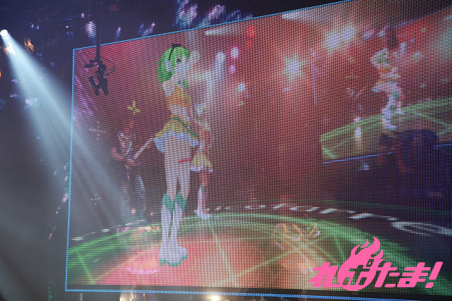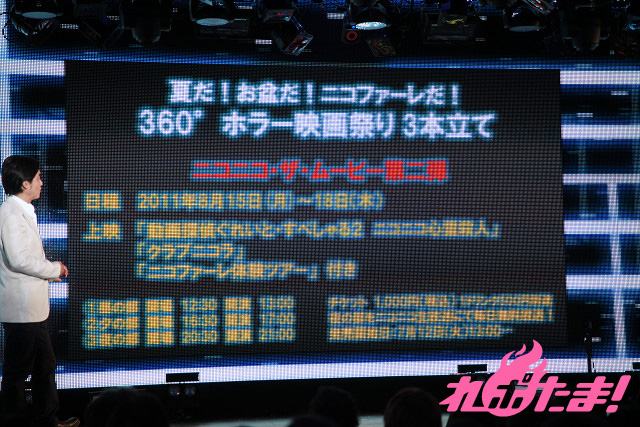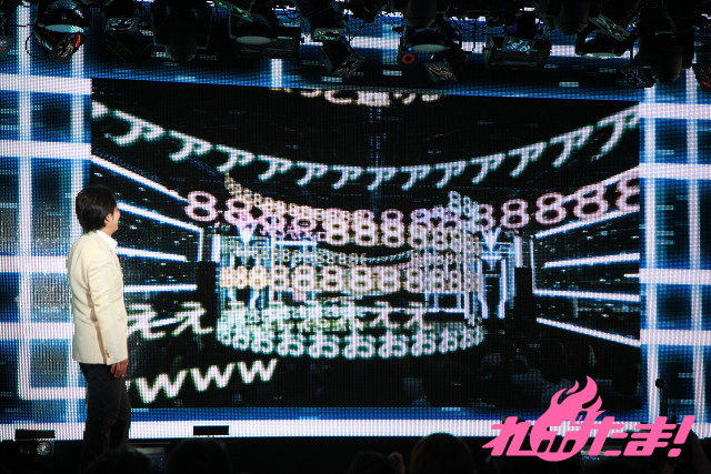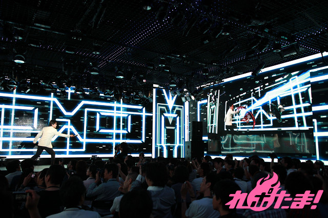 また、AR(拡張現実)技術を使用した演出も注目。夏野氏が持っている棒状のものから、映画『スターウォーズ』に出てくるライトセーバーのような光の剣が現れ、ARによって生み出されたドラゴンと戦う、というデモンストレーションや、ライブ中にヴォーカロイドのGUMIが現れて、リアルのダンサーと一緒に踊ったりと、見どころ満載!さらに、当日ライブ会場に行けないファンの方々に楽しんでもらえるように、PCユーザーコメントの色をカラフルにし、目立つようにする「サイリウムコメント」や、イベント中に動いている5つのカメラから、好きなアングルを選ぶことのできる機能も搭載。