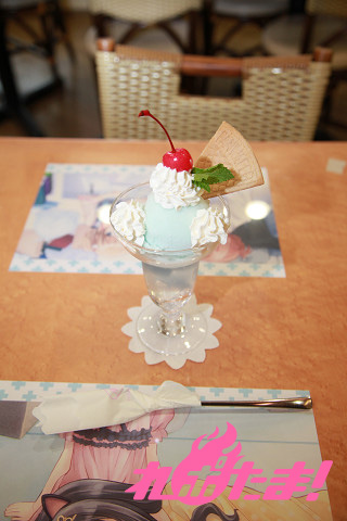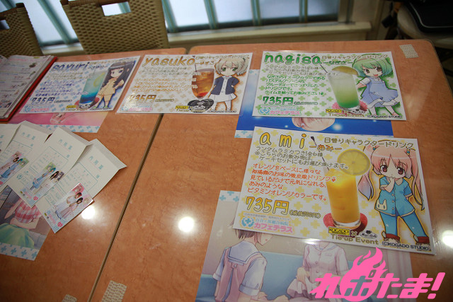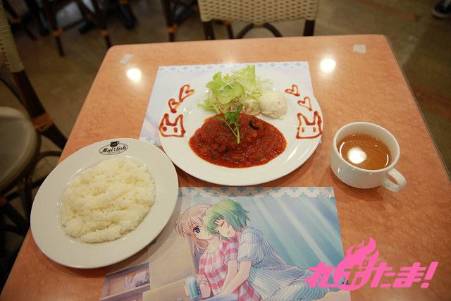 期間中は店員の女の子が、作品に登場する衣装を身にまとって出迎えてくれるほか、ここでしか楽しむことのできないオリジナルメニューも充実! オーダーした方全員にランチョンマット(1種類)とキャラクターのイラストが入ったコースター(全6種類からランダムで1つ)をプレゼント。ゲームを予約した人(※予約が証明できるものを持参して下さい)にはさらに缶バッジ特典がついてくるぞ!