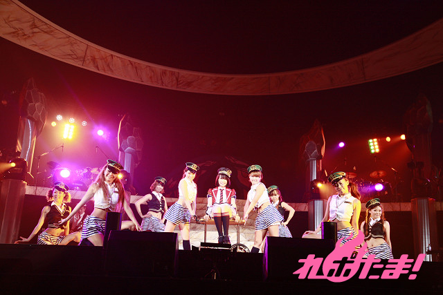今回のライブのテーマは「旅」。車掌の服装に身を包んだチェリーボーイズ(バックバンド)や社内販売員姿のteam YO-DA(バックダンサー)もライブに彩りを添える。大きな機関車も登場し、花道をレールに見立てて水樹を乗せて場内を一周するという圧巻のパフォーマンスが披露された。
