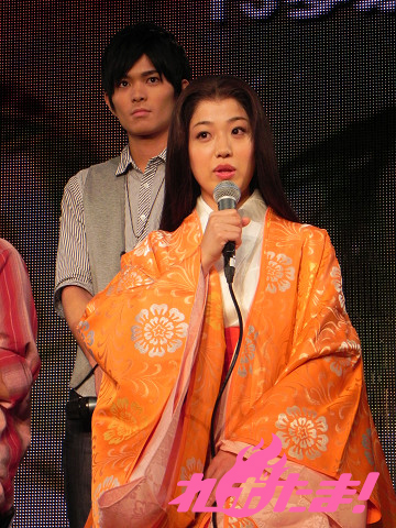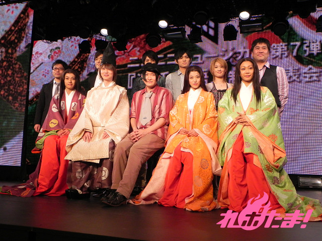 そして再び役者陣が登場。ぽこたさん、富田真帆さん、大河元気さん、Kimeruさん、高木俊さん、平田裕一郎さん、川澄美慎さん、冨士枝千夏さんがそれぞれの役どころと舞台への意気込みを語った。ぽこたさんは「1回目とは全く違って歴史ものなのでどうなるか不安ですが、頑張って行きたいと思います。」、富田さんは「これから色々な書物を読んで勉強し、紫の上をしっかり演じたいと思っています」と2人とも舞台へ向けての意気込み十分の様子を見せた。ちなみに湯澤氏曰く、「小学生以下のお子さんは見ない方がいい」とのこと。また、ニコニコ動画で活躍中の歌い手を1日ゲストとして出演させる計画もあるそうだ。