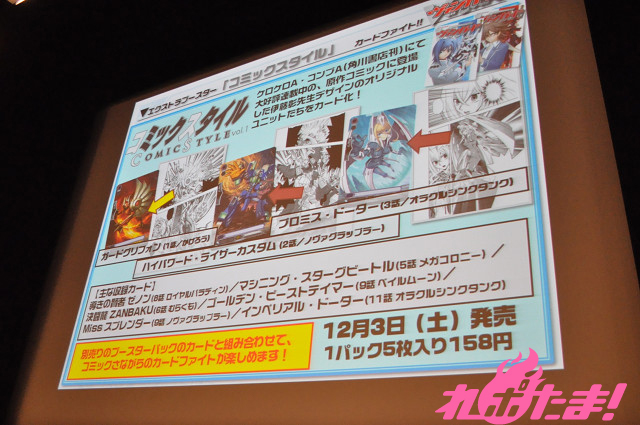また、『ケロケロA』、『コンプA』にて連載中の原作コミックに登場した伊藤彰先生デザインのオリジナルユニットたちをカード化。ガードグリフォン(かげろう)、ハイパワード・ライザーカスタム(ノヴァグラップラー)、プロミス・ドーター(オラクルシンクタンク)などが登場する。コミックさながらのカードファイトが楽しめる内容になりそうだ。さらに原作で登場したクランである「むらくも」のカードも登場。こちらは12月3日発売。デッキ構築に必要となるカードについては、第5弾ブースター「双剣覚醒」に収録されるとのこと。「双剣覚醒」は2012年1月14日発売だ。それからアイドル人魚グループ「バミューダ△」がエクストラブースターで登場することも決定。こちらの発売は2012年新春とのことなので楽しみにして待ちたい。