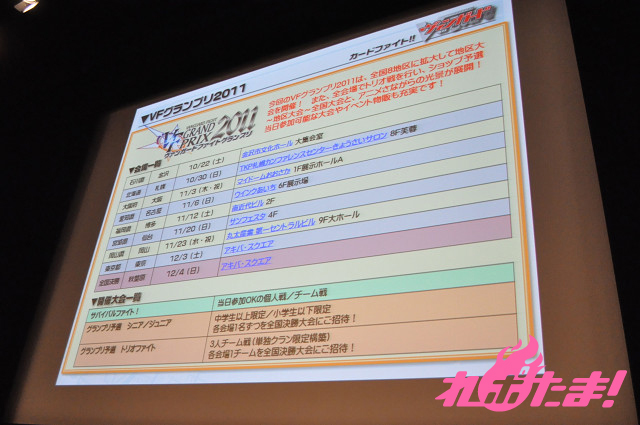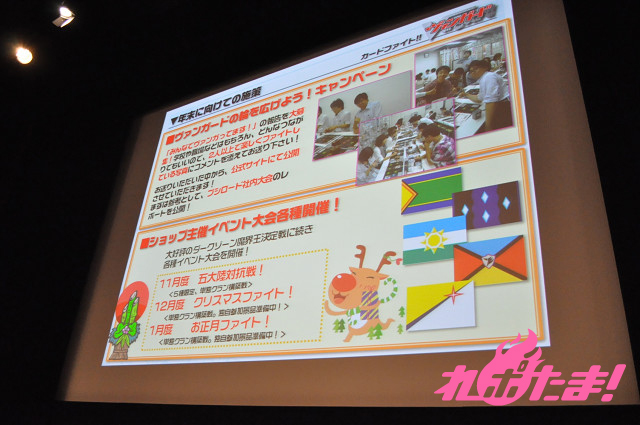 イベント情報としては、VFグランプリ2011と銘打ち、全国8地区に拡大して地区大会を開催することを発表。ショップ予選→地区大会→全国大会とアニメさながらの展開となっている。また当日参加可能な大会なども設定。気軽に遊ぶことも可能だ。それからショップ主催イベントも「魔界王決定戦」に引き続き、11月は「五大陸対抗戦」、12月は「クリスマスファイト」、1月は「お正月ファイト」と継続されることも決まっている。また、公式サイトにて「ヴァンガードの輪を広げよう!キャンペーン」と銘打ち、2人以上でファイトしている写真の募集もしている。これを機に、カードファイトをさらに楽しんでみてはいかがだろうか。