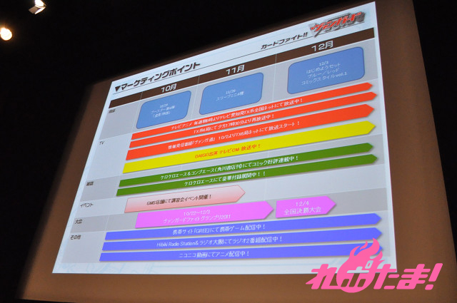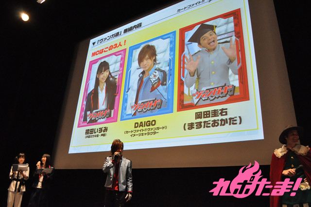 最後の発表は、次世代のキッズファイター育成番組「ヴァンガ道」について。こちらでは「カードファイト!!ヴァンガード」のイメージキャラクターのDAIGOがステージに登壇。「ヴァンガ道」は、10月2日より毎週日曜日午前10時より、テレビ東京系6局ネットにて放送開始する。「カードファイト!!ヴァンガード」を通じて色々なことを学んでいくという「総合キッズ育成アカデミー」となっている。アカデミー校長はDAIGO。その他、メインMCは橘田いずみとますだおかだの岡田圭右が担当する。今回発表された番組のプログラムは以下の通り。