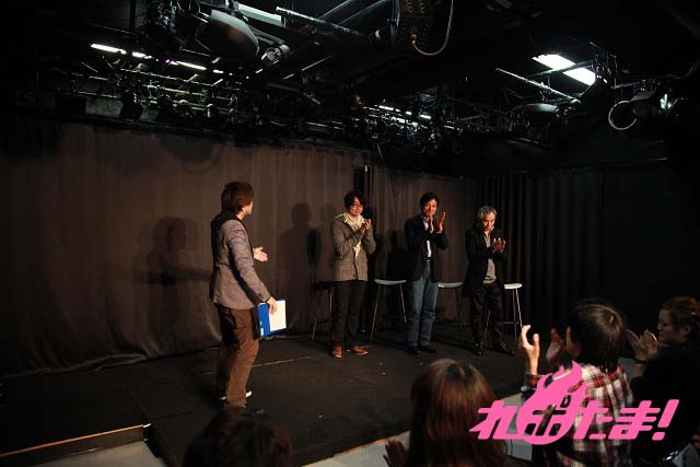 朗読が終わると出演者全員でのトークショー。今回のメンバーの年齢は79歳(納谷)、49歳(てらそま)、39歳(浜田)、29歳(市来)と、見事に10歳刻みの世代に分かれており、世代間の話に花が咲いた。