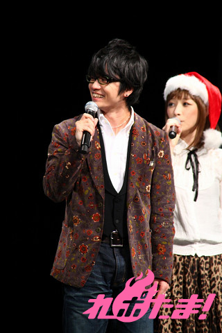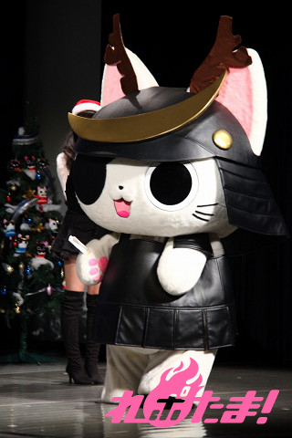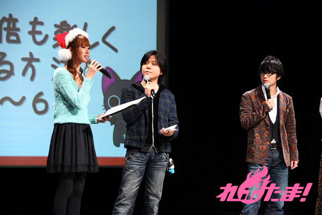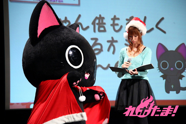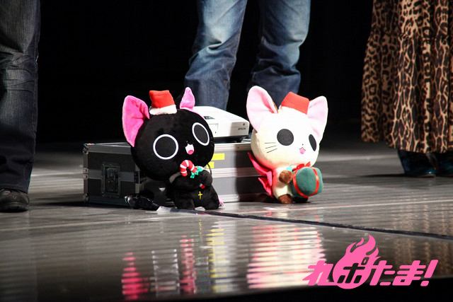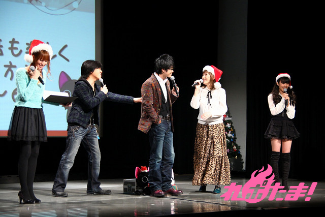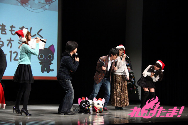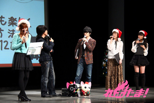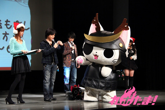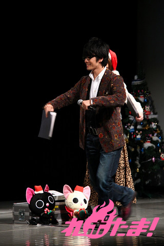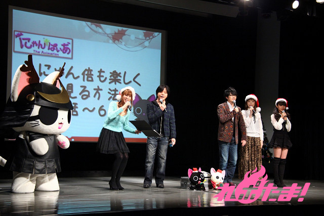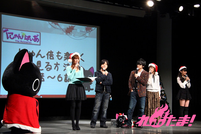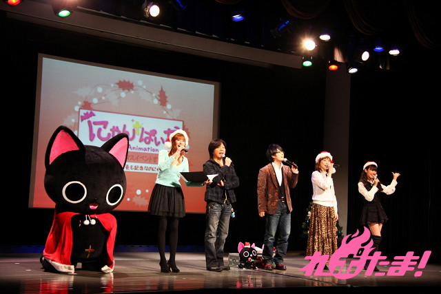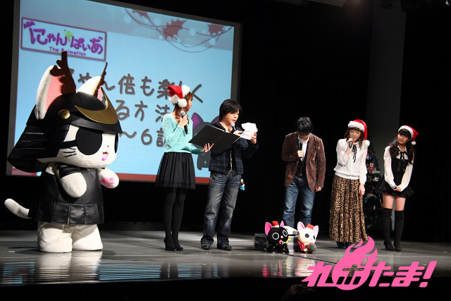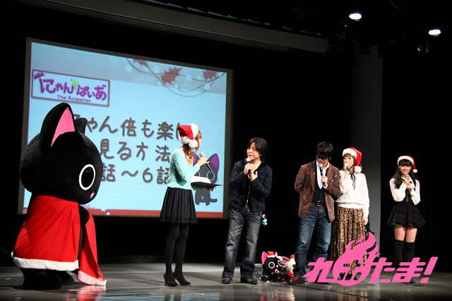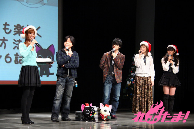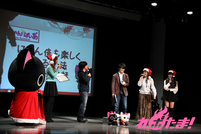 ステージにはクリスマスツリーが飾られ、早くもクリスマスムード一色。ステージに登場したのは、主人公にゃんぱいあと独眼竜まさむにゃ、そしてゲストは小清水亜美(にゃんぱいあ役)、杉山紀彰(まさむにゃ役)、福山 潤(にゃてんし役)、後藤邑子(茶々丸役)、前田希美(毛利くん・小森くん役)という5人でメインキャスト勢ぞろいとなった。