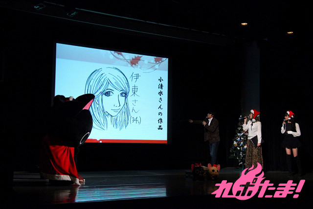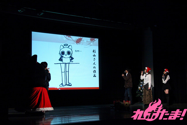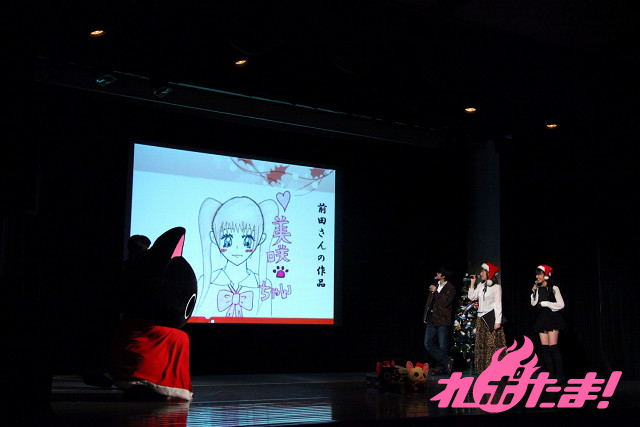 そしてここでお絵かきコーナー。顔が映らずツインテールという情報しかない美咲ちゃんの顔を予想して描いてみるというお題で、それぞれが思い思いの美咲ちゃんを描いてきたが、にゃてんしが上におり竹馬みたいに操っている絵を描いた杉山や、某漫画の主人公風の絵を描いた後藤など、各キャストともに非常に上手いユニークなイラストを披露。会場は上手さに関心すると共に爆笑の渦に巻き込まれていた。