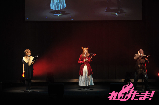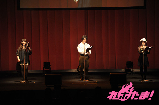 会場は期待に満ちあふれていた。そんな中、たくさんの拍手で幕はあがり、勇者役の福山潤、女騎士役の沢城みゆき、女魔法使い役の福圓美里が登場。台本を片手に叫ぶ。