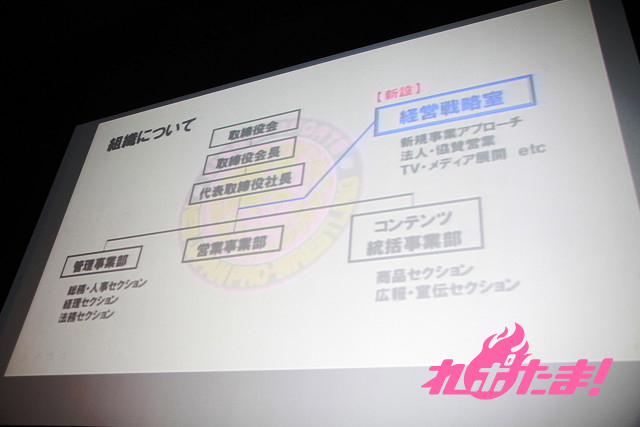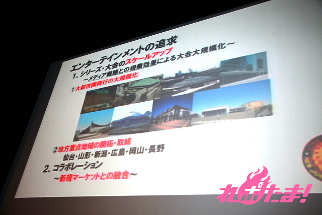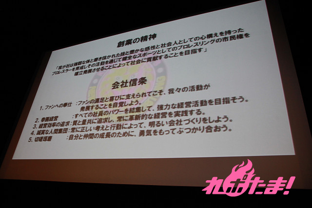 ミルキィホームズの三森すずこ、橘田いずみ、新日本プロレスの尾崎仁彦リングアナウンサーによる司会のもと、まずは方向性について菅林直樹社長と営業担当の古園 隆氏より新体制が発表された。大都市圏での興行のスケールアップ、さらに格闘技熱のとりわけ高い地域への開拓への取り組み、社会貢献への積極的参画、ファンクラブの充実などが挙げられた。