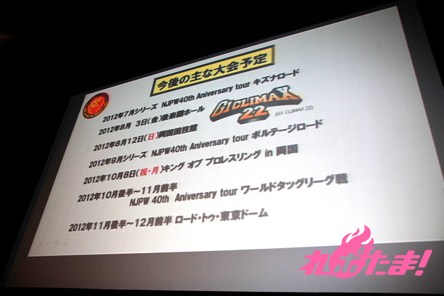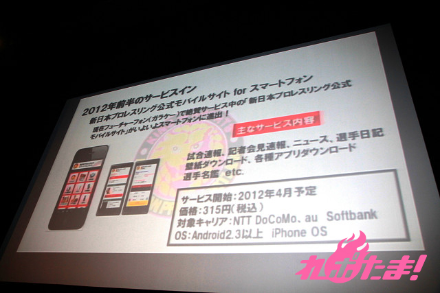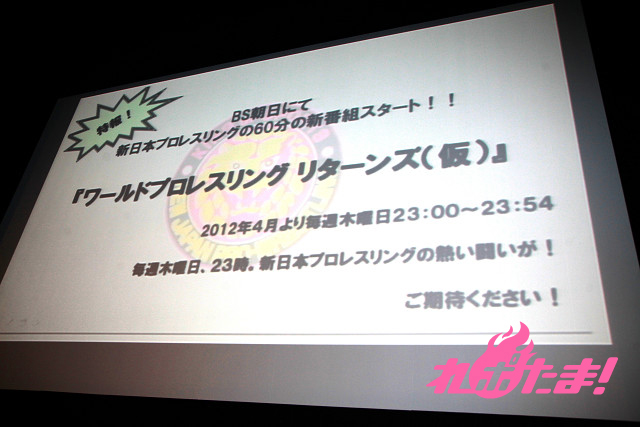 また、この日ツイッターを始めたことを発表した、人気レスラーの棚橋弘至選手をゲストに迎え、2012年の試合日程を発表。大会名などに関しても簡明化を図るほか、東日本大震災の被災地への復興支援プランを明かすなど、新規ファンの獲得につなげていく構えだ。