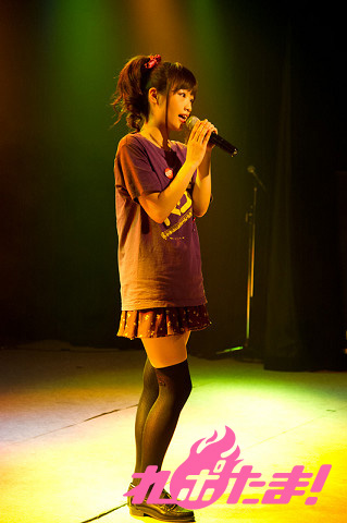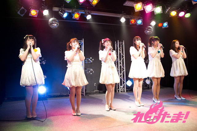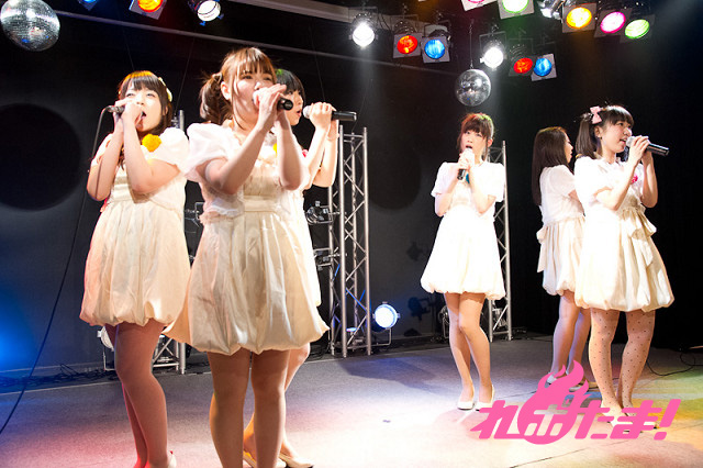 お揃いの衣装で登場したのはモバゲーとGREEで配信しているアイドル育成型ソーシャルネットワークゲーム『プリンセスプロダクション』に出演している、桜野姫香役の古谷静佳さん、月見里ちさ役の福原由莉奈さん、柏木七海役の柏山奈々美さん、北川珠希役の小松真奈さん、黒澤ふたば役の神山サヤさん、吉永綾乃役の慶長美沙記さん。作品の紹介やキャラクターの紹介を行いテーマソング「いつもkiss me」を歌唱した。