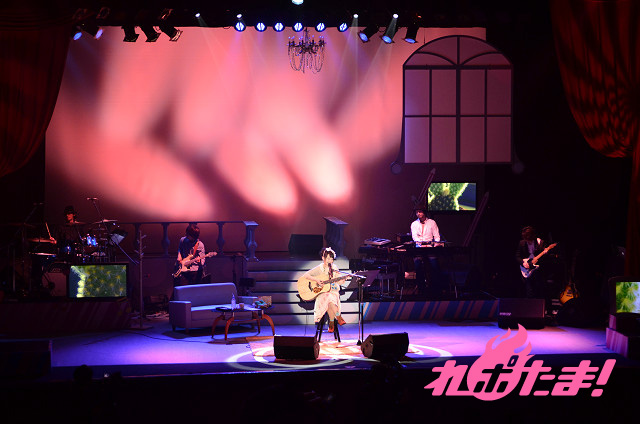 ソファに座った伊藤さんがやさしい歌声で「いじわるな恋ソファー」を歌うと、さらにここで彼女の傍らにギターが登場。