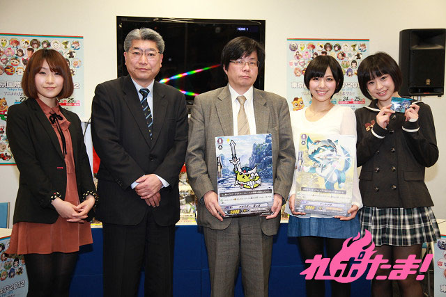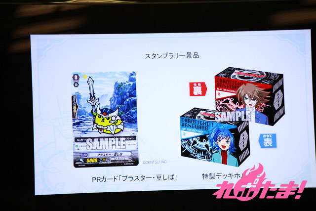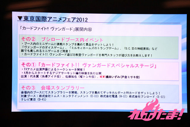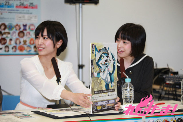 続いては、ブシロードの木谷高明取締役社長、声優の寺川愛美、徳井青空が登場。来場者全員に配られる『カードファイト!! ヴァンガード』のPRカード、ブース内イベント、スペシャルステージ、そしてトムス・エンタテインメント/電通/テレビ東京ブースとの連動企画であるスタンプラリーなど、ブシロード関連のイベントを中心に紹介した。