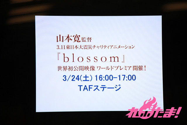 続いては、『アニマトリックス』や『ほしのこえ』『センコロール』などを手がけてきた、Project blossomの竹内宏彰プロデューサーが登場。東日本大震災以来、たびたび被災地を訪れた山本寛監督と竹内Pが何かできないかと考えた結果生まれた作品『blossom』を紹介。