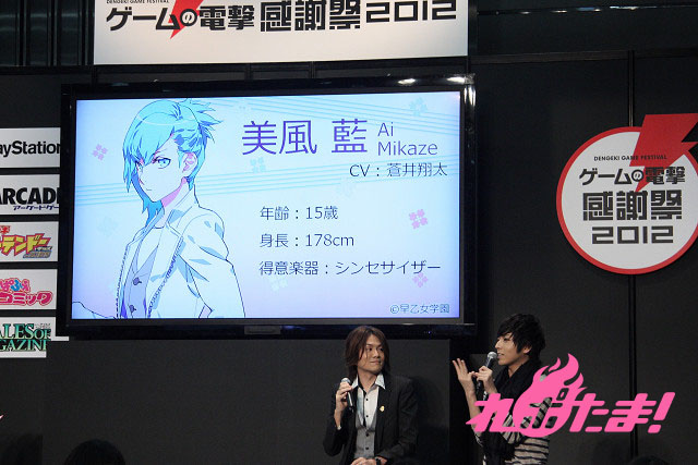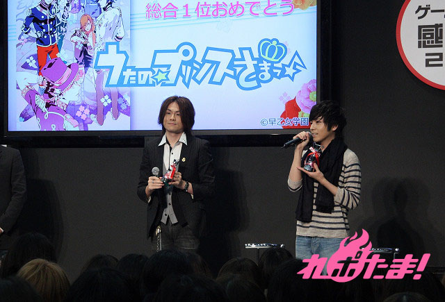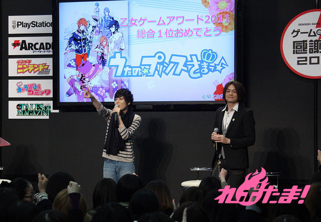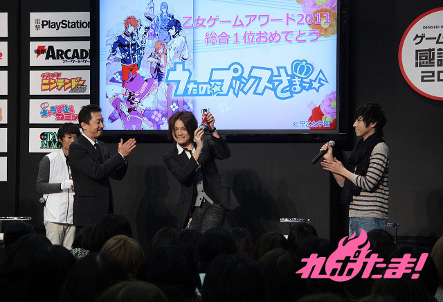 3月18日(日)に「ゲームの電撃 感謝祭 2012」で発表された“乙女ゲームアワード2011”。このアワードで4冠&総合1位となった「うたの☆プリンスさまっ♪」のスペシャルステージが同日に開催された。ステージには音楽プロデューサーを務める上松範康、新作PSP用ゲーム『うたの☆プリンスさまっ♪Debut』で美風藍を演じる声優の蒼井翔太がトロフィーを授与された。