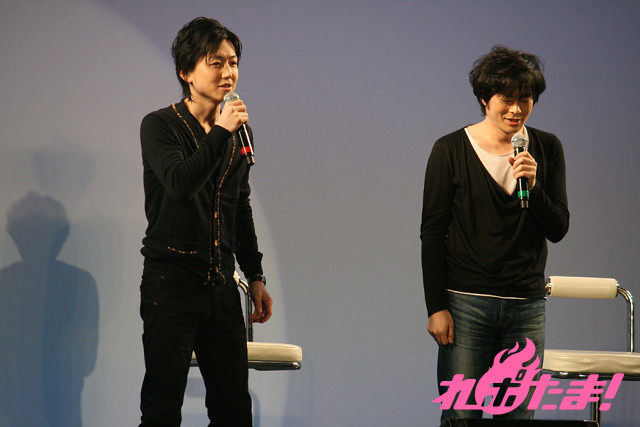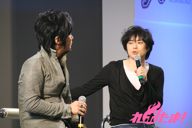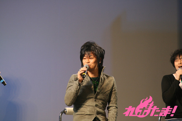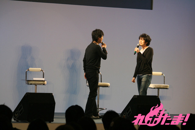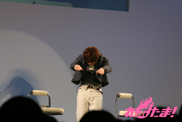 そしてお次はウルフ・エニアクル役の小野大輔さんからのメッセージ。こちらは菅沼さんが考案した「エイ・エイ・ジー(AGE)!」という掛け声を菅沼さん自身にイベントの最後にやって欲しい、江口さんには「ガンダムAGE-2」のものまねをやって欲しいなどの無茶ぶりをし、場内を笑いの渦に巻き込んだ。それを受けた江口さんは無言でAGE-2のポーズを取り、「声優なのになんで動きの物まねなんだよ!」と突っ込まれていた。