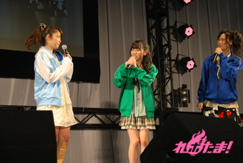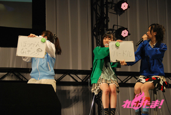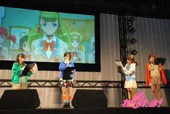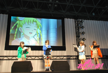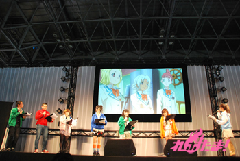 続いての“しゃっふるアフレコ”のコーナーは両作品のあるシーンの配役をシャッフルして演じるもの。なんとここで両作品に出演している茅野愛衣さんがシークレットゲストで登場! まず『ラグランジェ』1話のシーンに、まどか役を小松さん、ラン役を石原さんが挑戦。急なスタートにあわてる二人。『モーパイ』9話は茉莉香を石原さん、グリューエル役を瀬戸さん、ジェニー役を茅野さん、それ以外のキャラを保村さんと佐藤利奈さんも演じた。今回は素晴らしい出来で、会場からも拍手喝采。「(佐藤利奈さんの演じる)ジェニーと違って優しかったけど、これはありかも」と佐藤監督も絶賛。茅野さんは「ご本人の前で演じるのはプレッシャーでした」。
