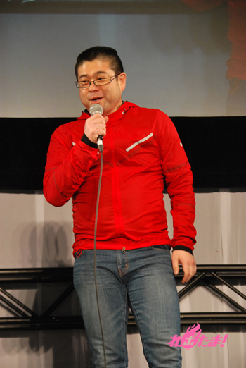 そして全出演者がステージに集結。『ラグランジェ』キャストの3人はジャージ姿で「ジャージ部」をアピール。『モーパイ』の2人は「ヨット部」のパーカーで応戦。しかし最後に入場した佐藤監督は赤いウィンドブレーカーだった(笑)。
