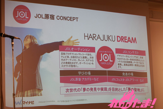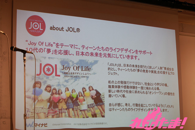 通常のフードコードに加え、ステージや放送スタジオ、ビューティールームやインターネットルームなどを設置する同店では、芸能界デビューを目指す「JOLオーディション」や、デザイナーなどクリエイター育成を目指す「JOLコンテスト」などを開催。若者の「夢の発見や実現=夢活」を応援するという新スタイルの施設になっている。4月12日に開催されたオープニングレセプションには、ゲストとしてアイドリング!!!の横山ルリカ、河村唯、SUPER☆GiRLSの八坂沙織、志村理佳、荒井玲良、田中美麗が登場。アイドルとして活躍しながら追い続けている自分たちの夢を、それぞれ語った。