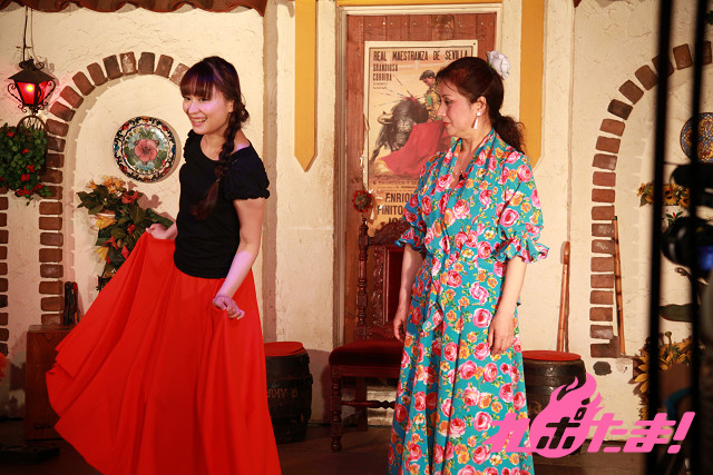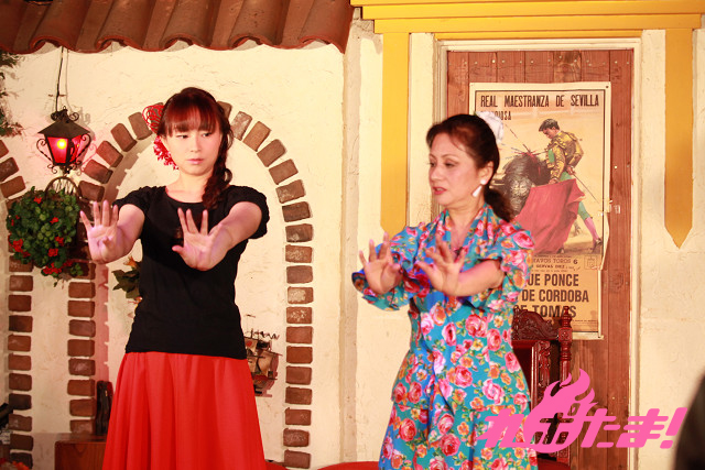 と、ここでスタッフから「せっかく来たんだから、今井さんもダンスやってみましょうか?」と、『アニぷら』名物、いつもの無茶ぶり、もといおもてなし(笑)! フラメンコのチャリート先生にダンスを教わることに!