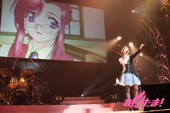 そして、まだまだ観客達の興奮は収まらず、アンコールの大合唱へ!ステージには、KOTOKOさんが登場し、楽屋でみんなの歌を聴きながら「なんて懐かしいんだろうと浸っていた」という。そんなKOTOKOさんは、みんなの期待に応え、「Snow Angel」を熱唱!これは、DVD「おねがい☆ティーチャー Music Collection」に収録されたもので、スクリーンにはそのPV=みずほ先生達の映像も流れていく。この曲もKOTOKOさんが作詞を務め、「“曇りガラスに書いた永遠を♪”という詞の辺りは、映像も連動していて、とても好きなシーン」と話してくれた。