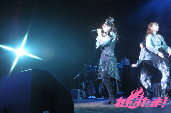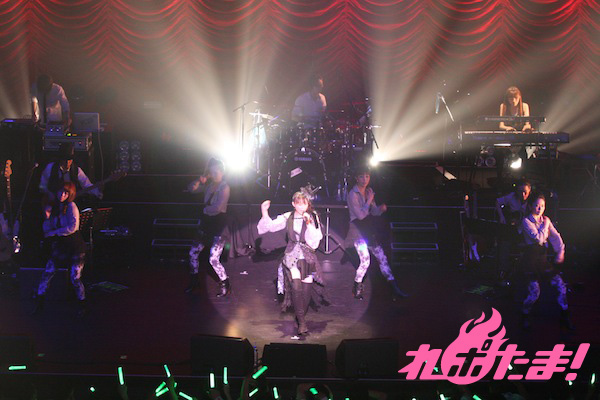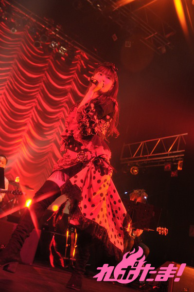 そして紅い情熱的なドレスに着替えたミンゴスが登場! MCでは、テレビ番組『アニソンぷらす』で習ったフラメンコの振り付けも披露するなど、ノリノリのミンゴス。「Hasta La Vista」を激しいダンスと共に披露すると「満天星」「蒼穹ノ月〜Crystal Moon」とムーディーな雰囲気の中で歌い上げた。