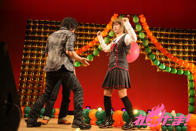 まずはイベントの目玉である舞台劇がスタート。客席から現れたのは森川智之さん、杉田智和さん、寺島拓篤さん扮する金髪美(?)3人組。ステージに上がると「シャケシャケシャケ♪」と軽快に腰振りダンスを披露します。