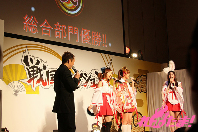 続いて「戦国コレクション」の歴史を振り返るプレゼンテーションムービーを上映。また週刊少年サンデーで連載中のマンガ「小悪魔王伝 戦コレ!」では、ゲーム「戦国コレクション」と連動して、イラストコンテスト企画の開催も発表された。コンテストの優秀作品は同漫画のキャラクター、そしてゲームの武将カードとして採用されるというからファンは必見だ。