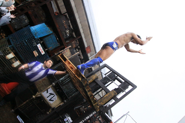 ・現地の高い所から飛んで跳ねての大立ち回りや普通じゃ使わない道具を使っての戦いなど、路上だから見れる試合展開。
