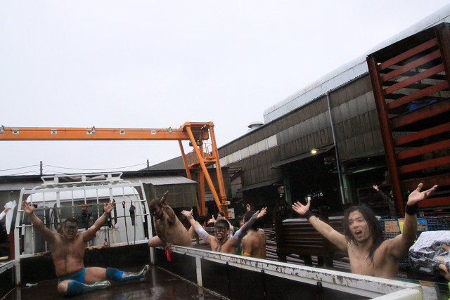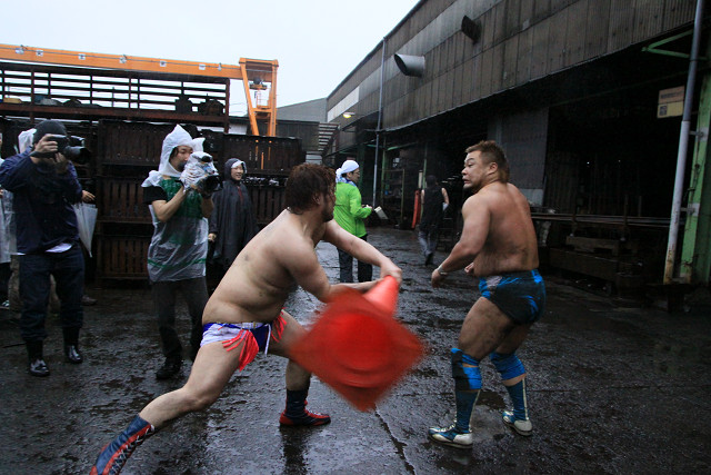 ・今回の工場プロレスであっても、工場にあるフォークリフト・コーン・自動販売機・石灰(何と200度だとか!)・トラック・バンなどをうまく使われていた。