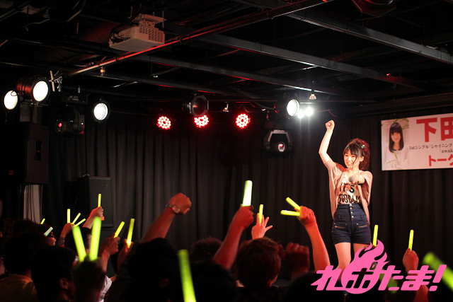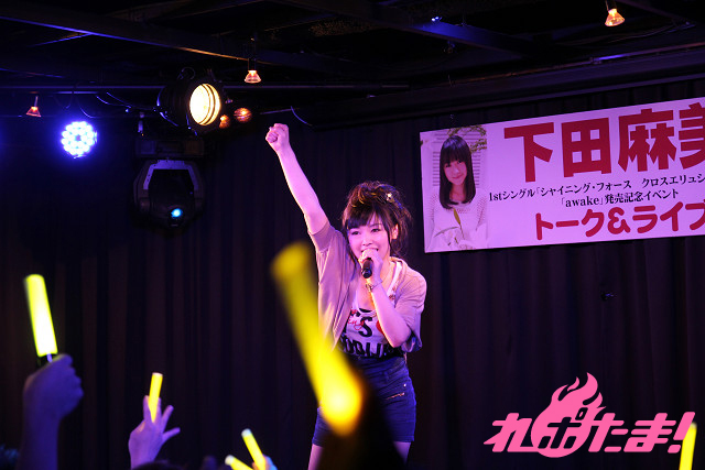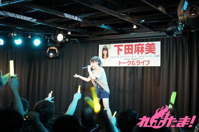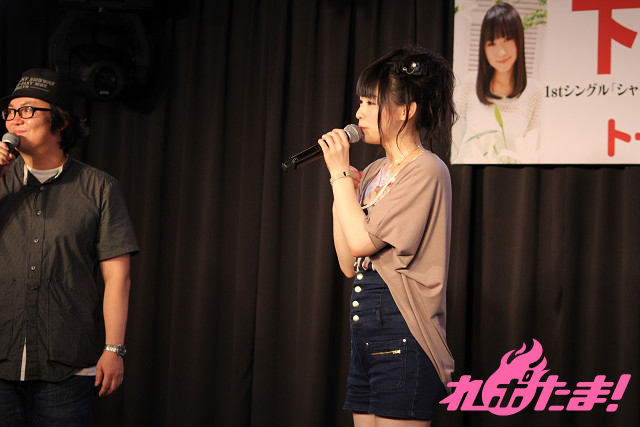 会場を満杯にした観客からの大きな歓声に迎えられて、元気いっぱいに登場した下田麻美さん。イベントは、まずリリースされたシングルについてのトークからスタート。