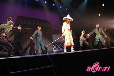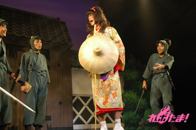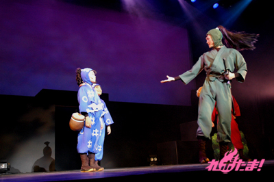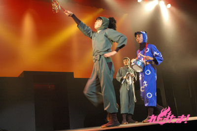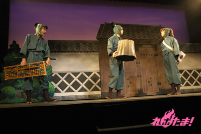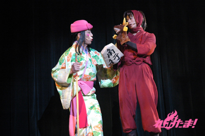可愛く元気いっぱいのくの一3人娘のユキ(演:金子有希さん)、トモミ(演:丸山未沙希さん)、シゲ(演:津田美波さん、美馬利恵子さん※ダブルキャスト)の前説からスタートします!ご存知アニメの主題歌である「勇気100%」の振り付けを観客にレクチャーし、トークで会場を暖めます。
