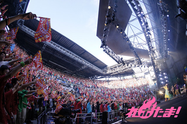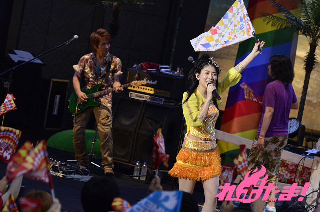 続く「Lush march!!」では、今回のライブで初登場した、オレンジと黄色のフラッグ(みのりんがハマッているマテ茶が元ネタ)が場内全体を覆い尽くした。