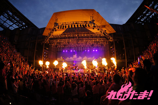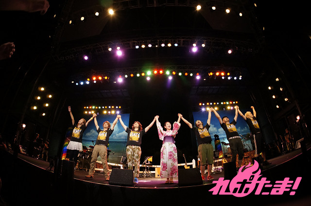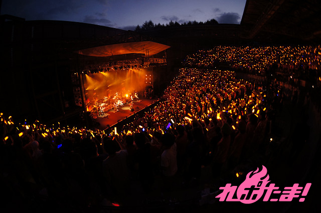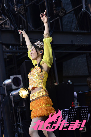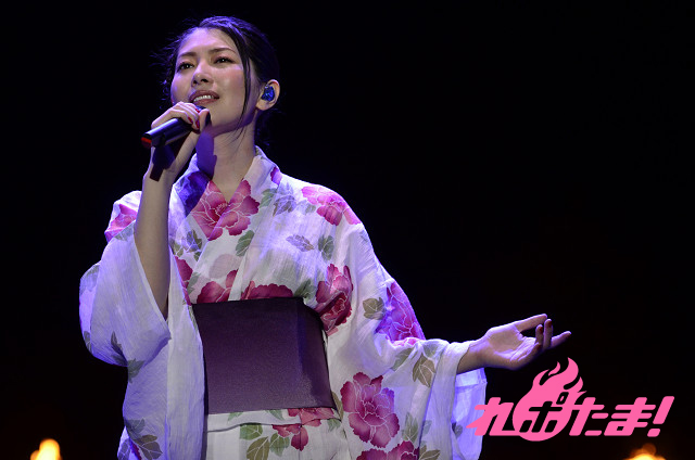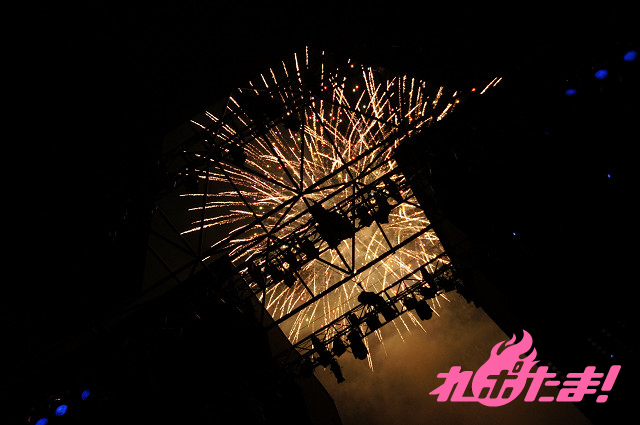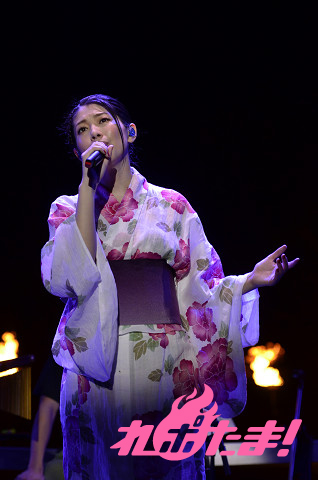 ダブルアンコールではステージの後ろが二つに分かれ、浴衣姿のみのりんが登場! 燃え上がる6つのファイアーをバックに「一等星~Acoustic Ver.~」を心を込めて歌い上げ、すっかり夜の帳が下りた夜空に打ち上げられた花火も華を添えた。
