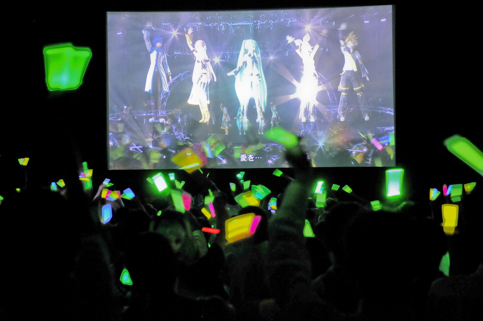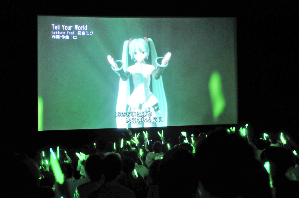 上映が始まると、観客たちはサイリウムを手に早くもスタンディング。流れてくる映像に合わせ、ミクの名を叫ぶファンも。スクリーンにミクが登場し「Google Chrome」のTVCMでもおなじみの「Tell Your World」からライブがスタートすると、その声にあわせ緑のサイリウムの光が一斉にリズムに合わせて動き始めた。