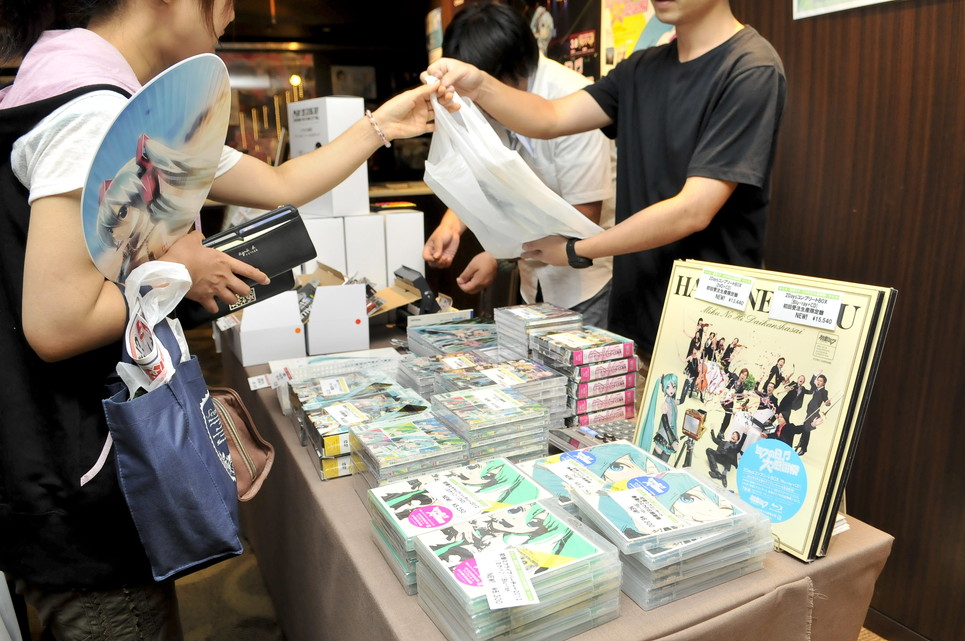開場時間の17時30分には、劇場のロビーはすでにミクファンの姿で溢れかえる盛況ぶりで、関連グッズの物販コーナーにも大勢の人が詰めかけた。大人に混じって、親に連れられてきた小学生らしき姿も。お小遣いを手に熱心にグッズを眺めるその姿に、年代を問わず幅広く愛される初音ミク人気の凄さを感じさせられた。